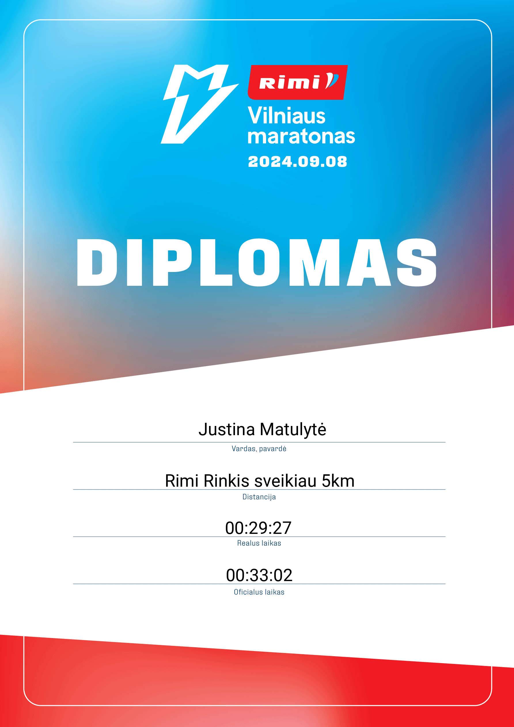 | 1126 | Justina Matulytė | 30621 | Lithuania | Rimi Rinkis sveikiau 5km | 00:33:02 | Diplomas | |