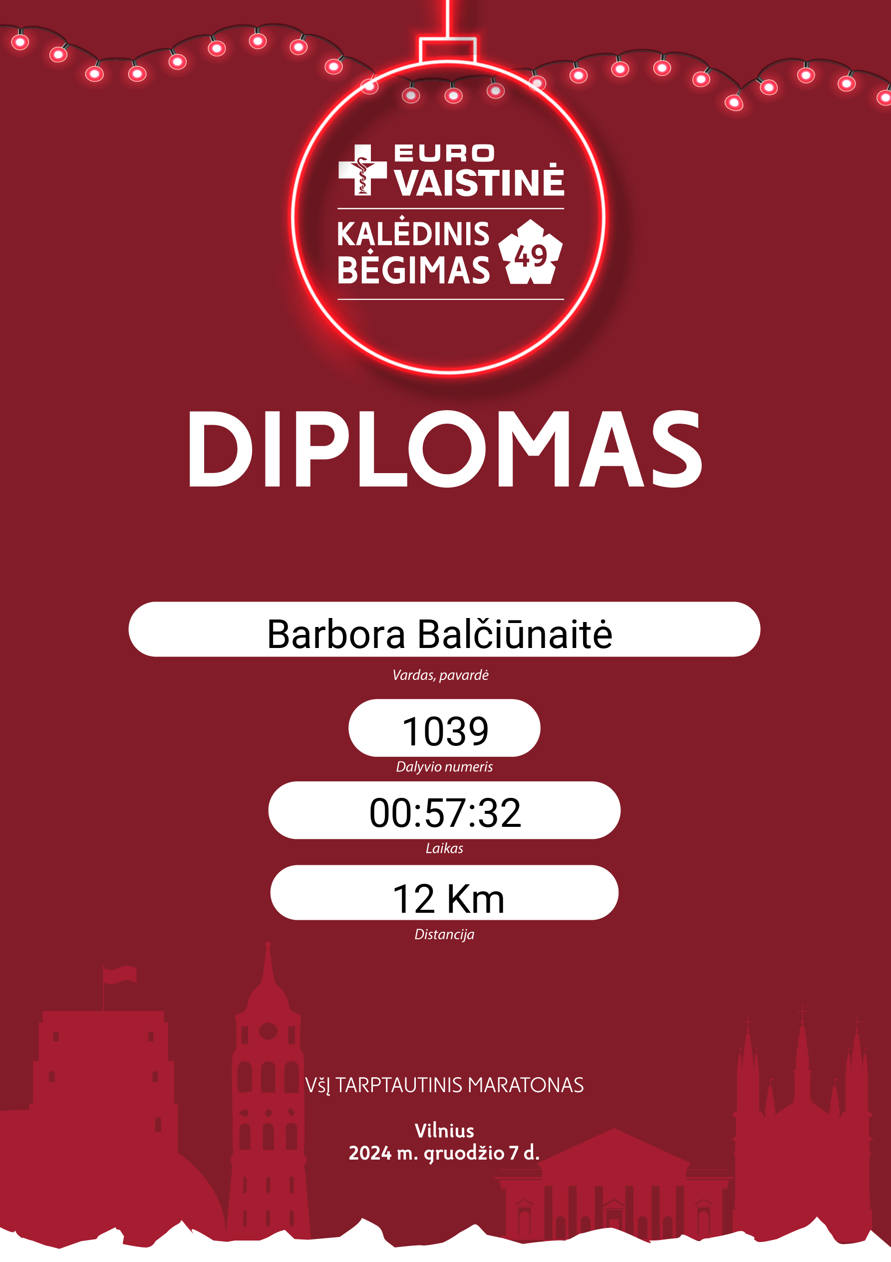 181 Barbora Balčiūnaitė Sostinės sporto centras 1039 Lithuania 12 Km 00:57:32 00:57:19 00:23:42 00:28:23 00:53:17 Diplomas