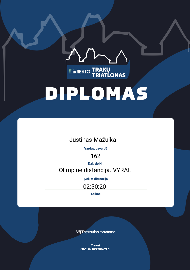 | 165 | Justinas Mažuika | TOP EXCHANGE | 162 | Lithuania | Olimpinė distancija. VYRAI. | 02:50:20 | Diplomas |