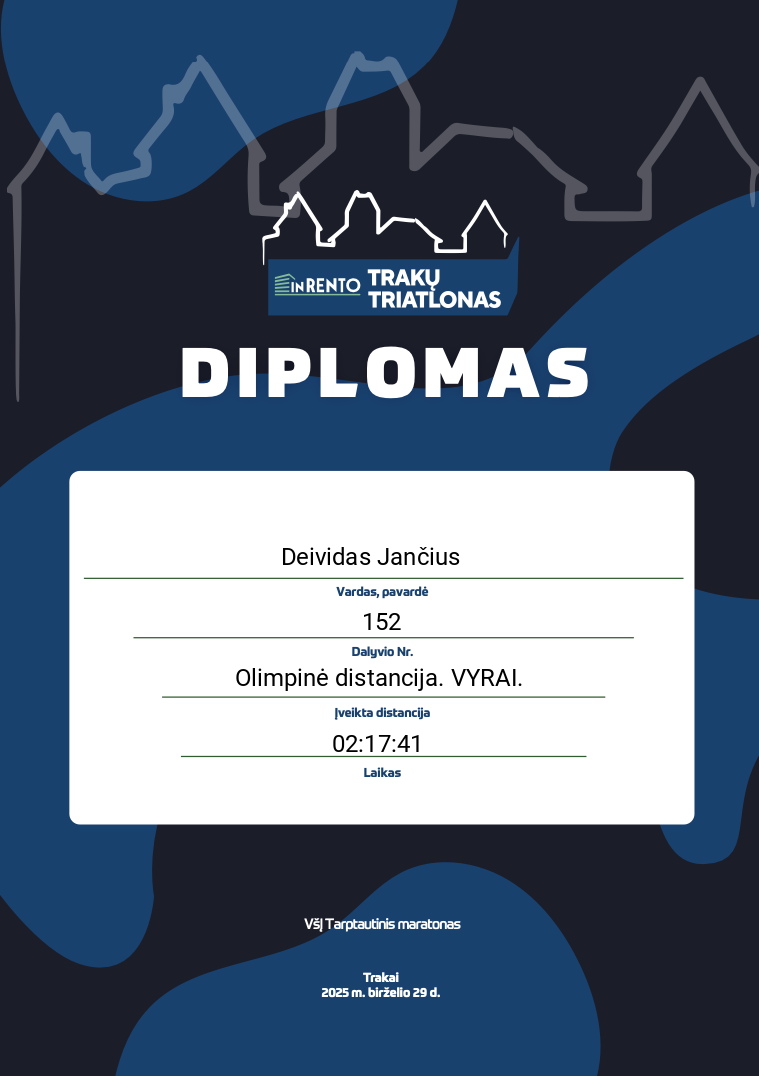 28 Deividas Jančius Kauno Triatlono Klubas 152 Lithuania Olimpinė distancija. VYRAI. 02:17:41 00:26:25 00:01:53 01:05:10 00:10:58 00:11:03 00:10:52 00:00:44 00:43:29 00:10:36 Diplomas