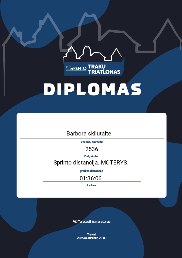 | 15 | Barbora skliutaite | 2536 | Lithuania | Sprinto distancija. MOTERYS. | 01:36:06 | Diplomas | |