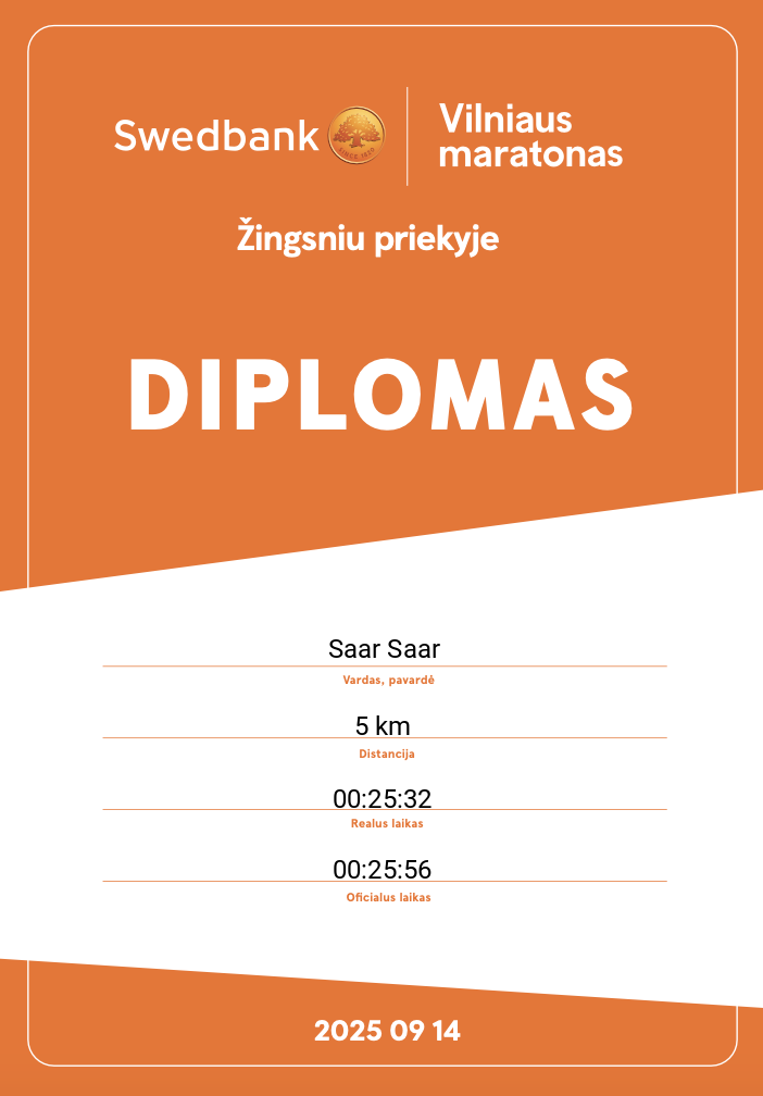 | 200 | Luc Dirckx | 860 | Belgium | „Swedbank“ Maratonas | 03:26:44 | Diplomas | |