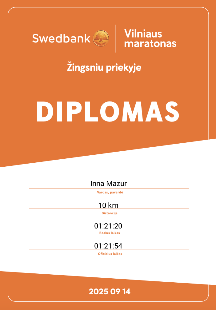 | 2120 | Inna Mazur | McDonald's | 21566 | Lithuania | 10 km | 01:21:54 | Diplomas |