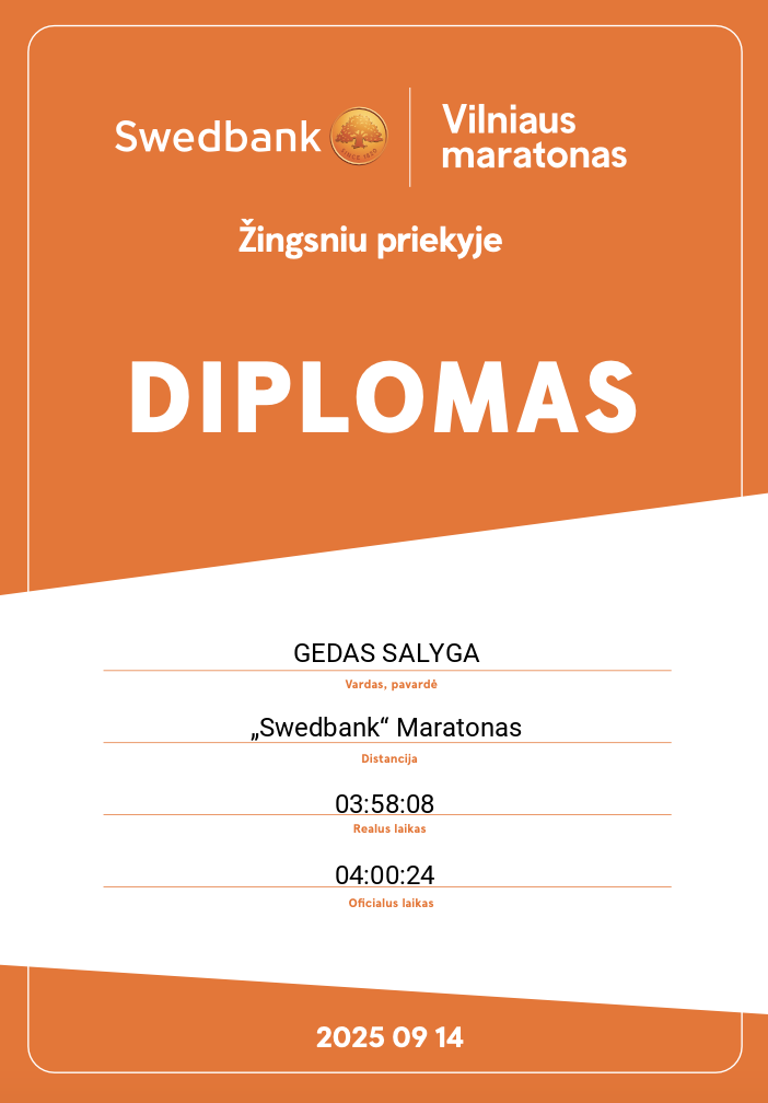 | 696 | GEDAS SALYGA | 1821 | Lithuania | „Swedbank“ Maratonas | 04:00:24 | Diplomas | |
