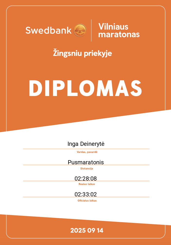 | 2597 | Inga Deinerytė | 11798 | Lithuania | Pusmaratonis | 02:33:02 | Diplomas | |