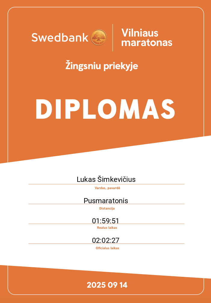 | 1424 | Lukas Šimkevičius | 12491 | Lithuania | Pusmaratonis | 02:02:27 | Diplomas | |