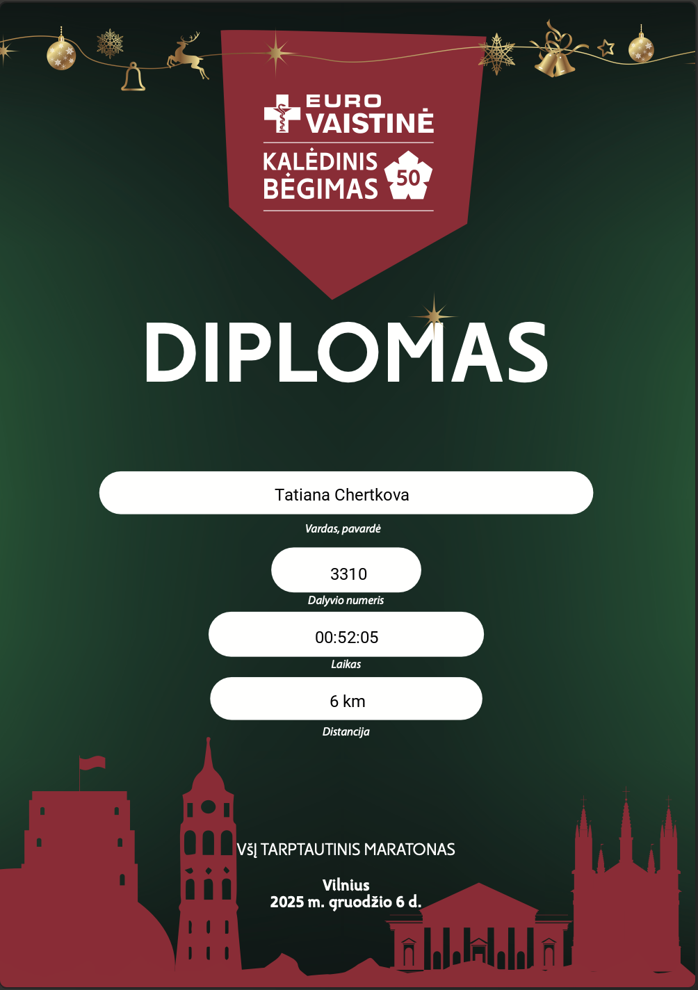 | 1236 | Tatiana Chertkova | RunStudio | 3310 | Lithuania | 6 km | 00:52:05 | Diplomas |