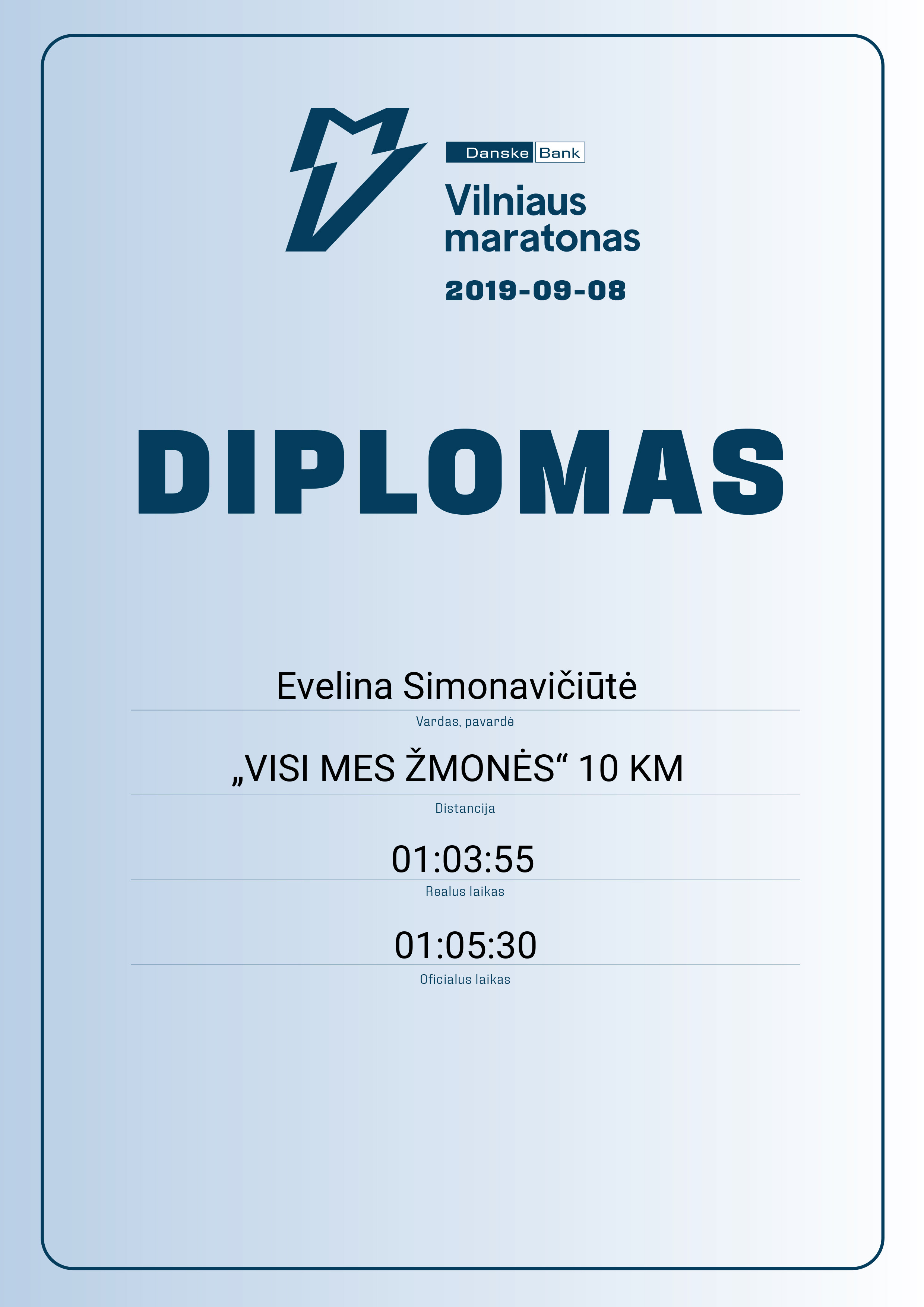 | 1730 | Evelina Dildė | 20342 | Lithuania | „VISI MES ŽMONĖS“ 10 KM | 01:10:54 | Diplomas | |
