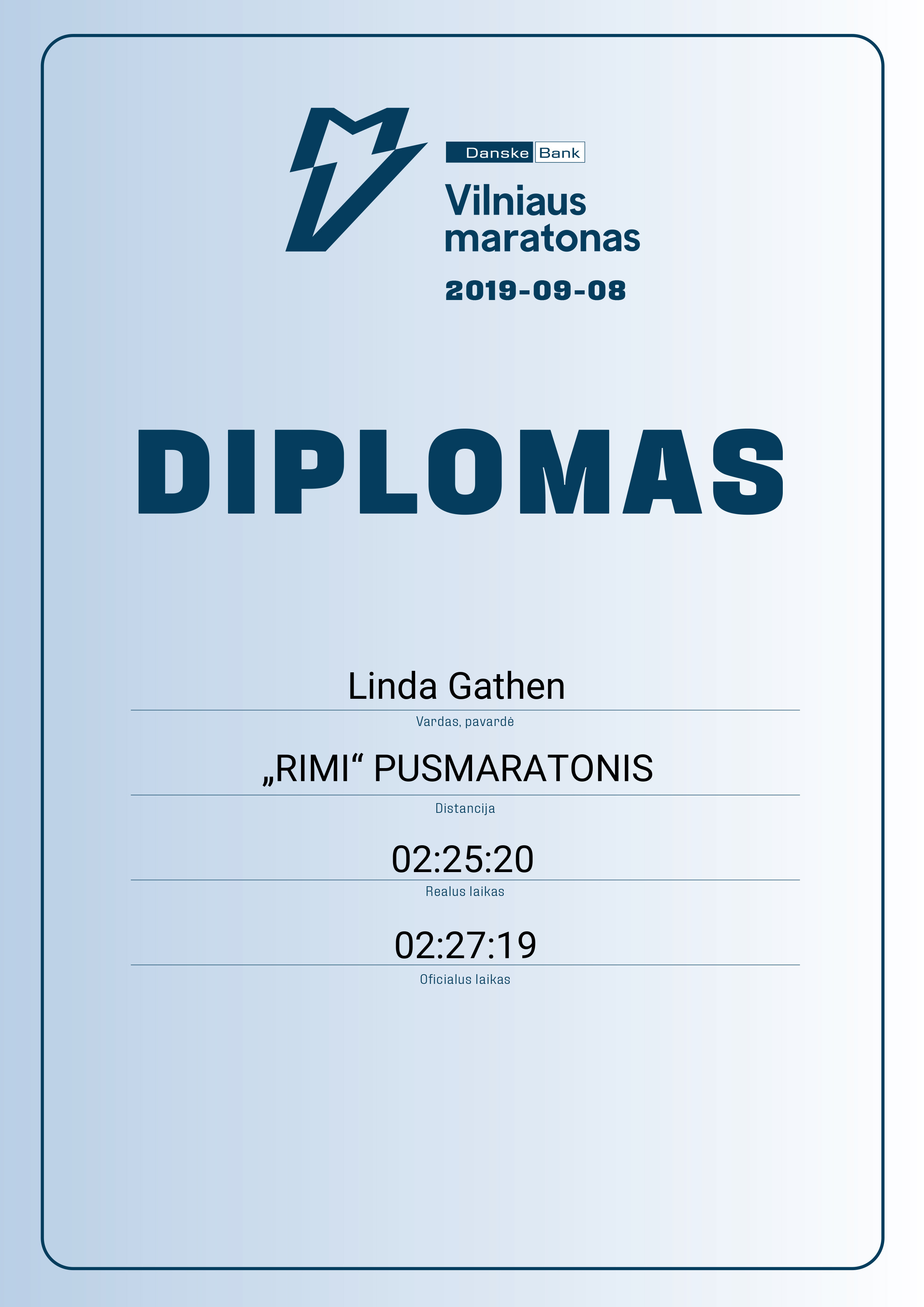 | 1614 | Linda Gathen | 11131 | Norway | „RIMI“ PUSMARATONIS | 02:27:19 | Diplomas | |
