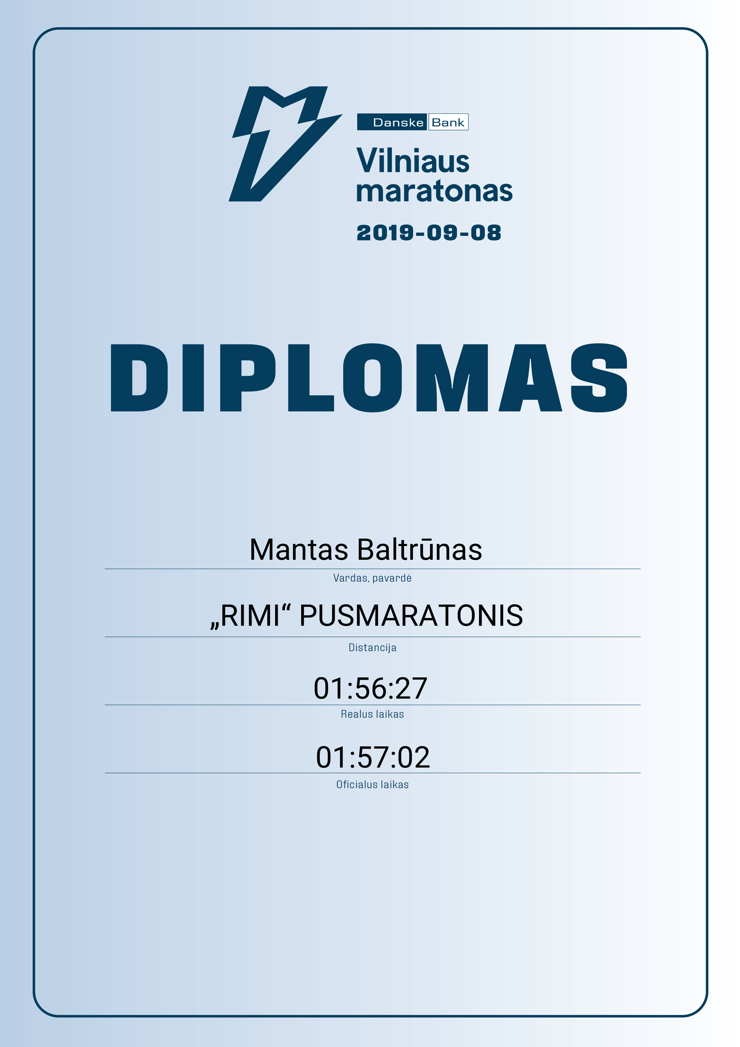 | 1018 | Justas Matijoška | 11209 | Lithuania | „RIMI“ PUSMARATONIS | 01:59:17 | Diplomas | |