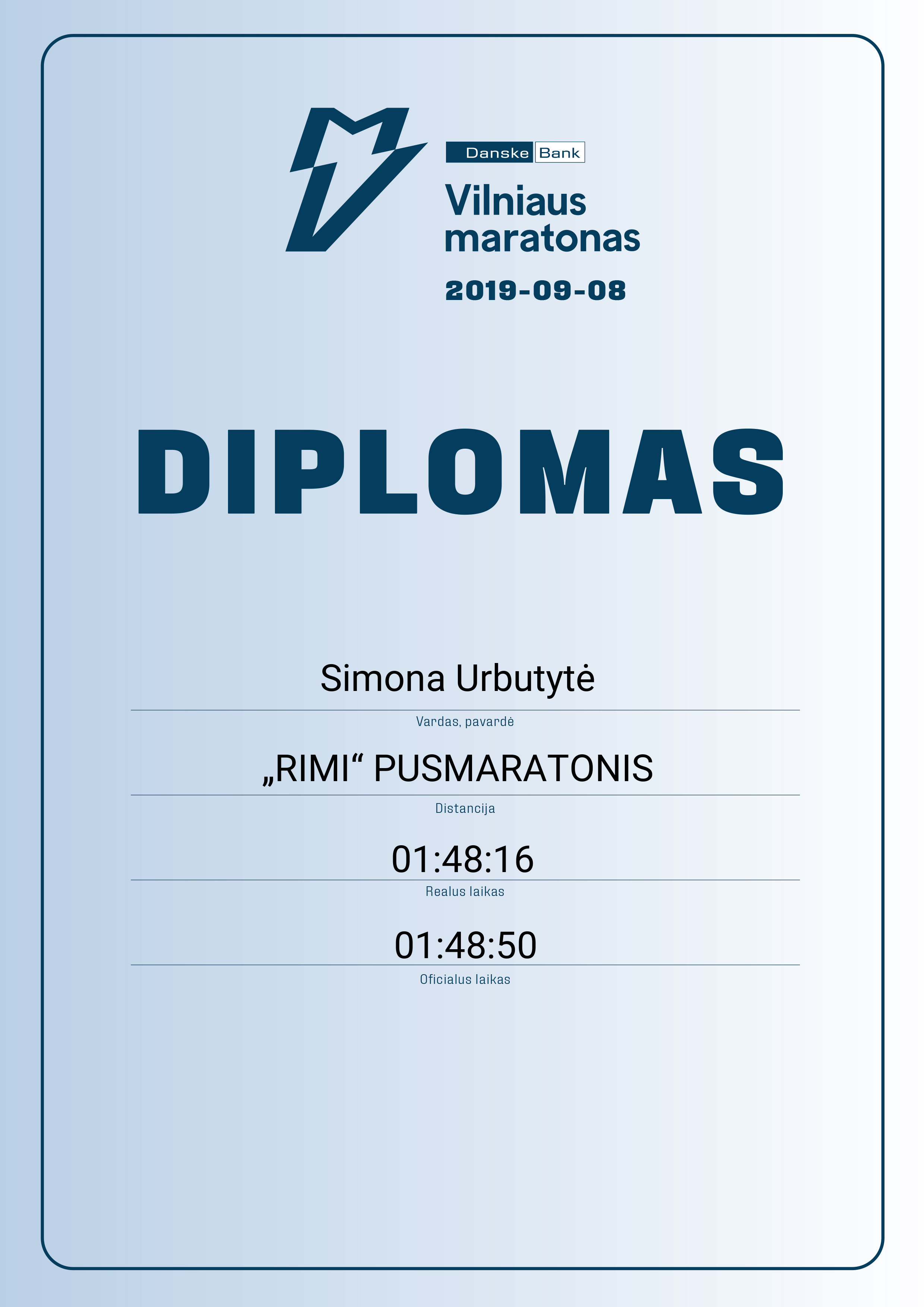 | 595 | Simona Urbutytė | 11668 | Lithuania | „RIMI“ PUSMARATONIS | 01:48:50 | Diplomas | |