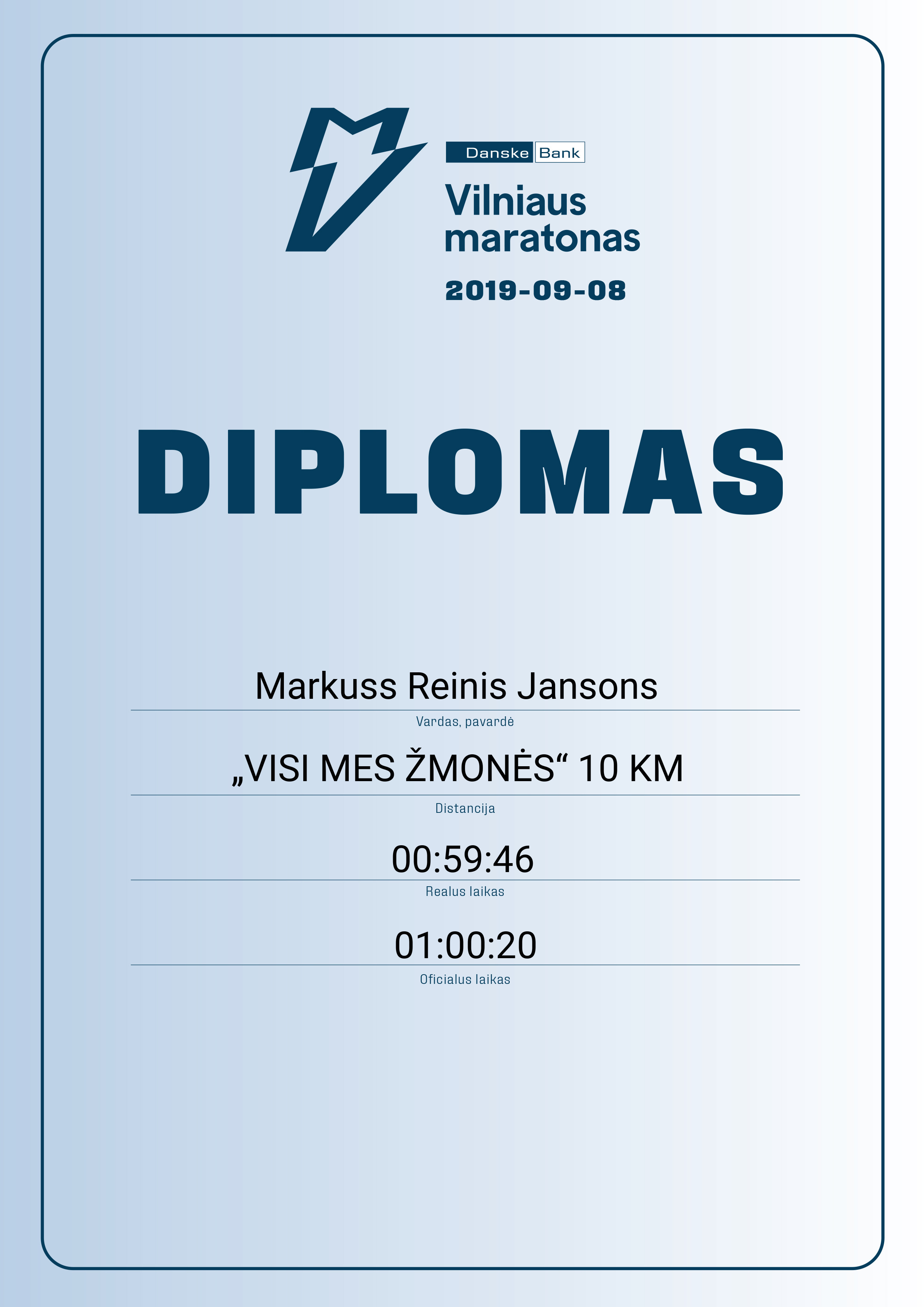 | 1035 | Markuss Reinis Jansons | 20246 | Latvia | „VISI MES ŽMONĖS“ 10 KM | 01:00:20 | Diplomas | |
