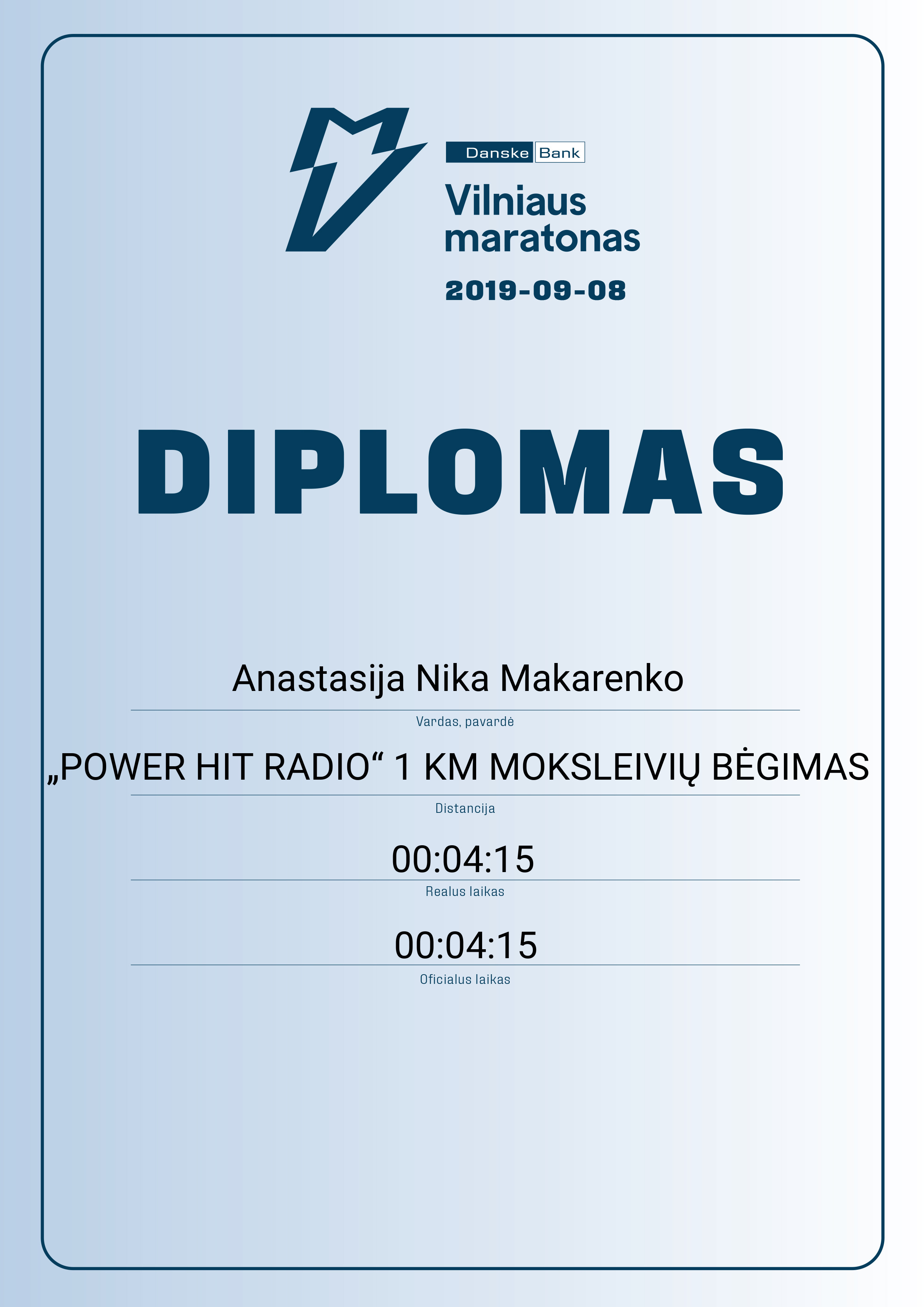 33 Dovydas Rimas FULLGAZZ 60024 Lithuania „POWER HIT RADIO“ 1 KM MOKSLEIVIŲ BĖGIMAS 00:04:16 00:04:16 Diplomas