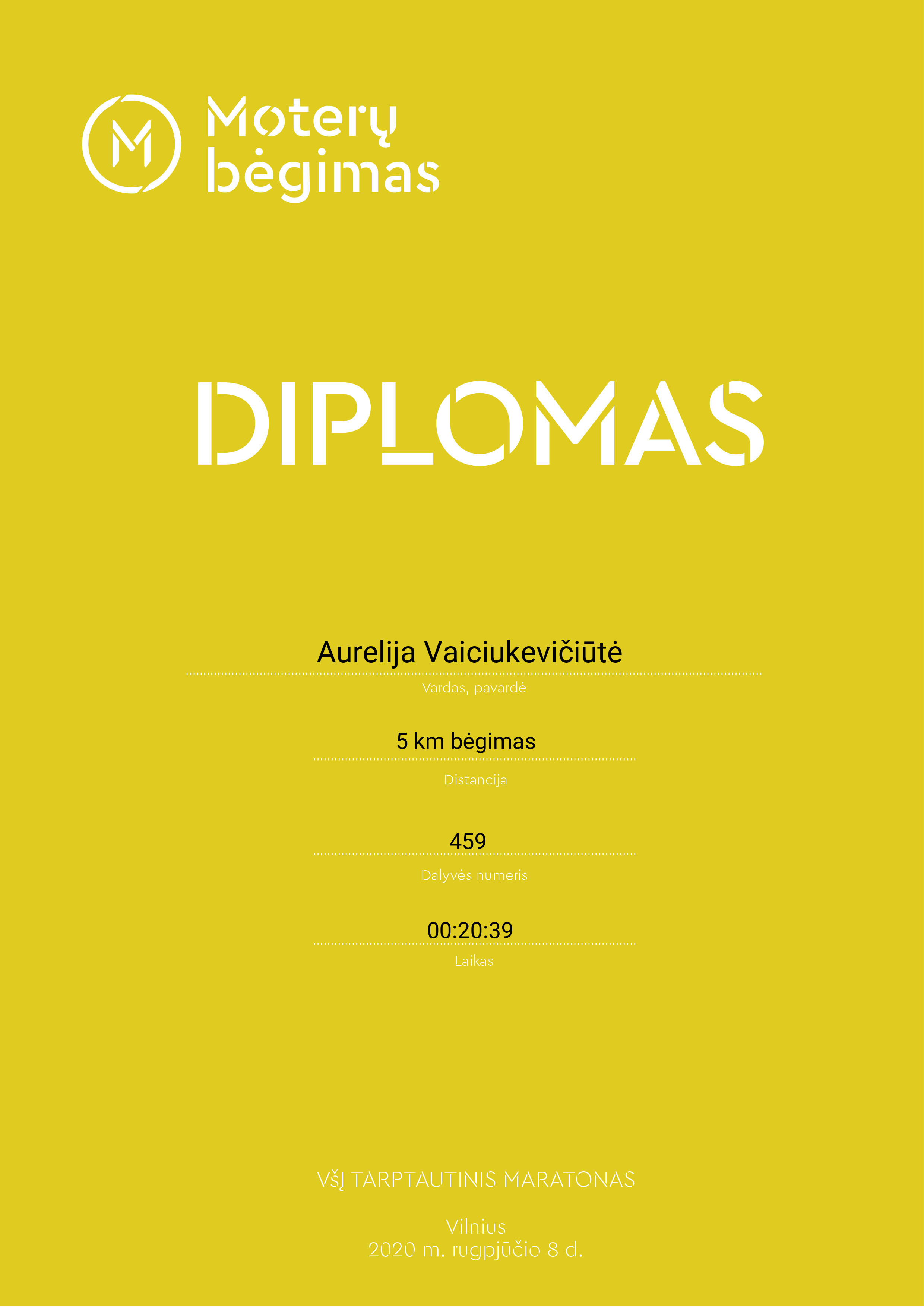 | 8 | Aurelija Vaiciukevičiūtė | NEKO Runners | 459 | Lithuania | 5 km bėgimas | 00:20:39 | Diplomas |